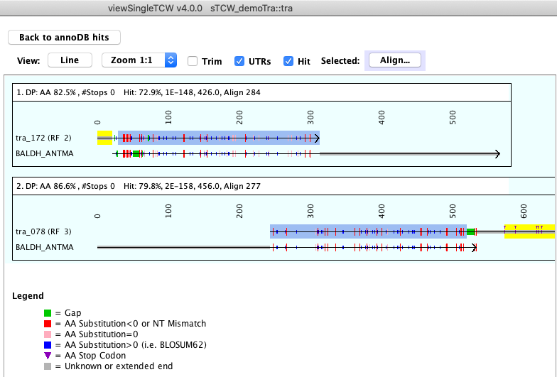The Align option shows the alignment of all sequences that have been assigned to a hit. The alignment shown below uses dynamic programming.
